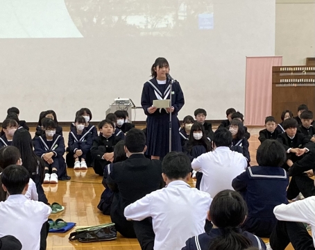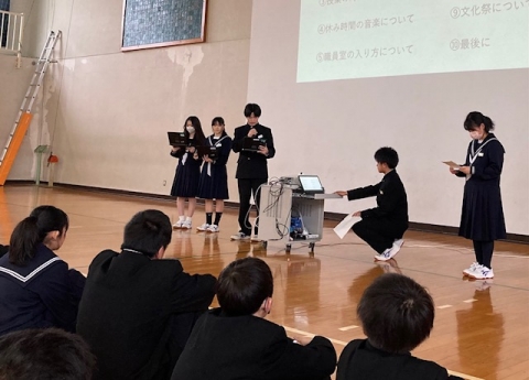 まず生徒会長から、礼儀・礼節を大切にすること、行事は生徒が企画すること等についての話がありました。