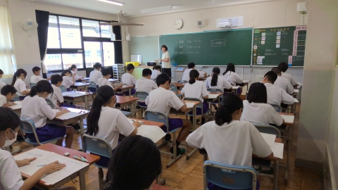 最初の科目は3年生が社会(写真1枚目)、2年生と1年生が英語(写真2枚目と3枚目)。英語はリスニングの問題を行っているところです。