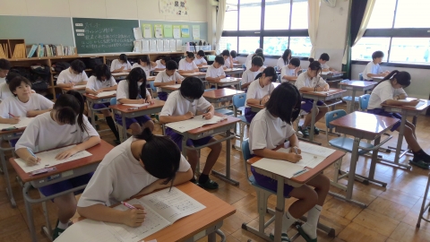 9月17日(水)、中間テスト1日目が始まりました。定期テストは各フロアのホールで行うのがいつものやり方ですが、今回は暑さ対策として教室で行っています。