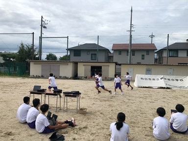 「スピードを維持しながら走るためには・・・」や「スムーズなバトンパスとは・・・」などの課題をもとに、班で協力しながら何度も練習を行っていました。また、バトンパスを他の班に見てもらいアドバイスをもらうなど、ICTを活用しながら取り組む姿も見ることができました。