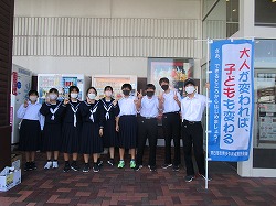 10月23日(日)秋晴れの中、新旧生徒会役員が、青少年育成市民会議の皆さんと「子ども・若者育成支援活動」一環として、「大人が変われば子どもも変わる」をスローガンに啓発活動を行いました。