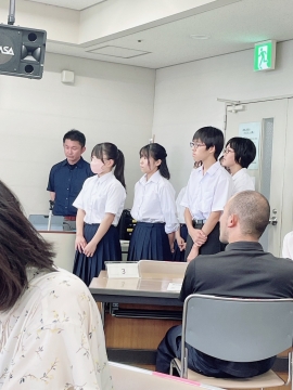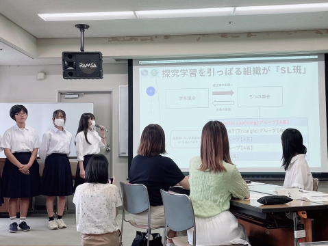 8月6日(火)午後、四日市市総合会館で行われたESD・SDGs研修会では、本校から教員と生徒が講師として参加しました。各小中学校から受講している先生方を前に、本校におけるSDGs Talksの取組について発表しました。