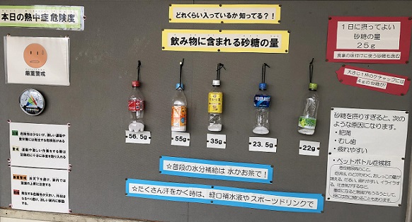 保健室前にも「熱中症になる危険度」や「飲み物に含まれる砂糖の量」など適切な水分補給についての掲示物があります。ぜひとも体に良い水分補給を心がけましょう!