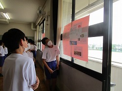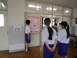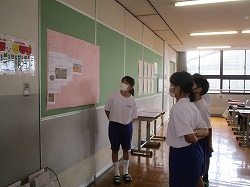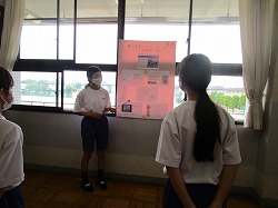 1年生の社会では、世界の国々について調べたことをポスターセッションで発表しました。それぞれのブースで説明者も一回ずつ交替しながら発表をすすめていきます。途中、松村先生より、作戦タイムの時間も設けてもらい、再度チャレンジしました。