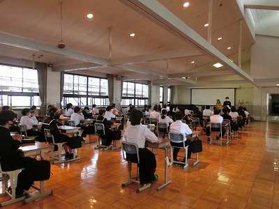 学年集会を行い、学級委員から今月の目標を発表してもらいました。その後テスト発表があり、みんなでテスト計画を立てました。