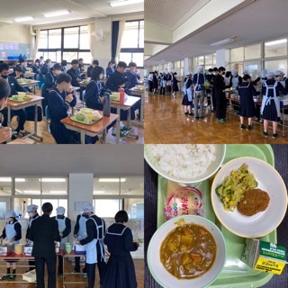 4月10日、いよいよ中学校給食がスタートしました。記念すべき、最初のメニューは、ポークカレーライス、メンチカツ、ツナサラダ、牛乳と、お祝いデザートでした。4限目の終わり頃から、カレーのいい匂いがしてきていました。給食当番は、帽子とマスク、エプロンをつけて盛りつけなどをします。皆が協力して準備をし、そして、いよいよいただきます!子どもたちに大人気のカレーです。美味しい〜、という声があちらこちらで聞かれました。