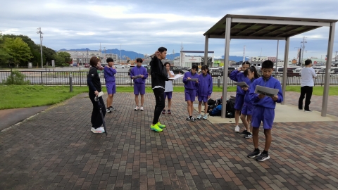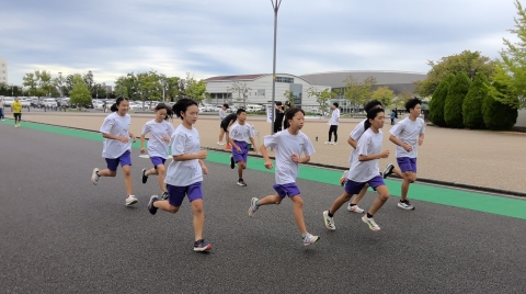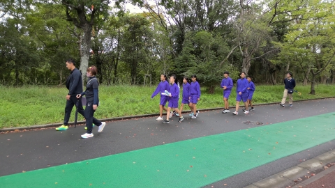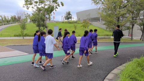 On the morning of Sunday, October 19, the Ekiden team is doing a practice run on the trim course at Chūō Ryokuchi Park in Yokkaichi City. The Junior High School Athletic Federation’s Newcomers’ Tournament ended yesterday, and many teams have come today for practice runs.