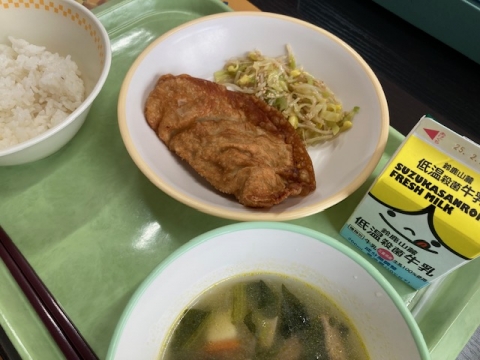 2月20日(木)の給食は米飯、牛乳、津ギョーザ、ナムル、春雨スープ。B級グルメとして有名になった「津ギョーザ」は四日市の給食でも定番になりました。もともとは津市の学校給食として開発されたメニューです。たくさんの工程がある「津ギョーザ」が給食に間に合うよう、今日も朝早くから調理していただいたとのことです。