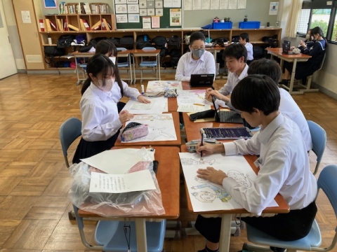 幼児向けの紙芝居の仕上げ中。この後、暁幼稚園に出向き、ジェンダーに関する紙芝居と園長先生へのインタビューを行います。
