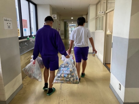 集まったアルミ缶を洗ってから、小さくつぶします。学校近くのマンションにも回収のお願いにうかがう予定です。