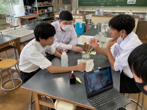 採取してきた海水で実験しています。午後は地域を歩きます。