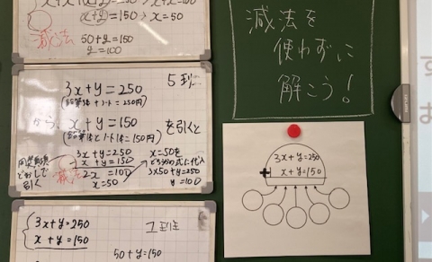 この連立方程式を満たす解をどうやって求めるか。班で話し合い、ホワイトボードにまとめています。