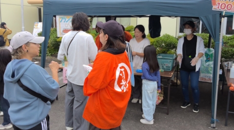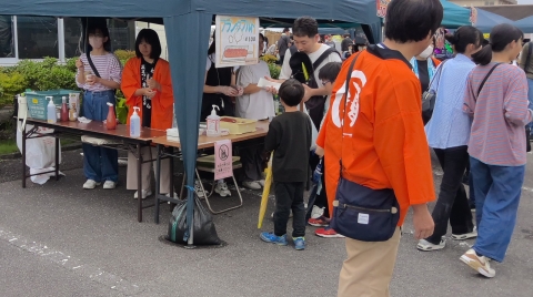 A short while ago, Mayor Mori stopped by the Tomisuahara Junior High School PTA’s frankfurter booth, and the “Senbon-biki” lottery game, assisted by the students, is also very busy.