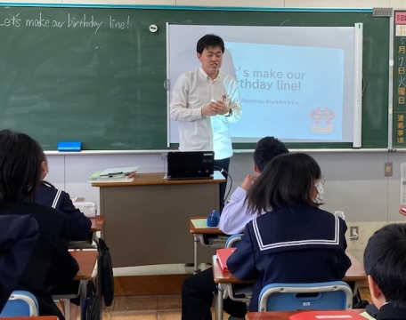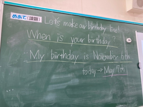 1年生の英語です。お誕生日のメッセージLINEを作るのかと思ったら、違いました。お誕生日をお互いに訊き合って、誕生日順に並ぶというactivityを通した、お誕生日の訊き方、日付の言い方の学習でした。