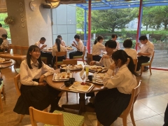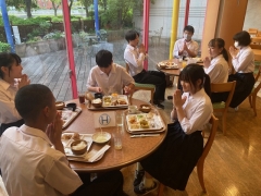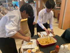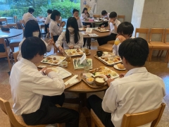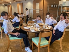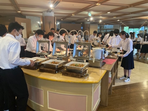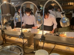 修学旅行1日目のホテルは、平和記念資料館から歩いてすぐのところにある広島市文化交流会館です。ホテルの方にご挨拶してから、大きい荷物を受け取って部屋に入りました。夕食は好きなものを好きなだけとって食べるスタイルです。プリンとソフトクリームも好きなだけ食べられます。でも、食べすぎには注意しましょうね。