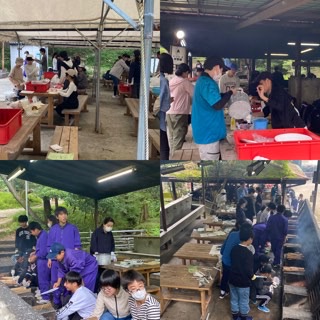 野外炊事がスタートしました。薪を運んだり、かまどに火を起こしたり、野菜を切ったり、鍋をクレンザーでコーティングしたりと、各班で分担して、カレーライス作りに奮闘中です。