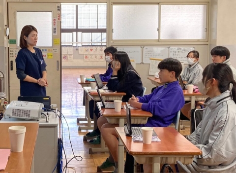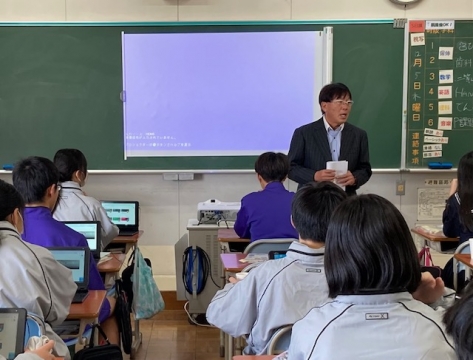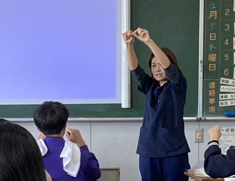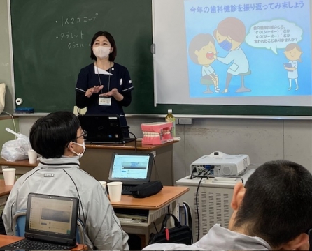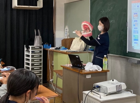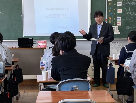 12月5日(木)、四日市歯科衛生士会からお二人の衛生士の方にお越しいただき、2年生の歯科保健指導を実施しました。各教室で同じ内容を同時に行いました。学校歯科医の田中先生にもご参加いただき、最後まで様子を見ていただきました。