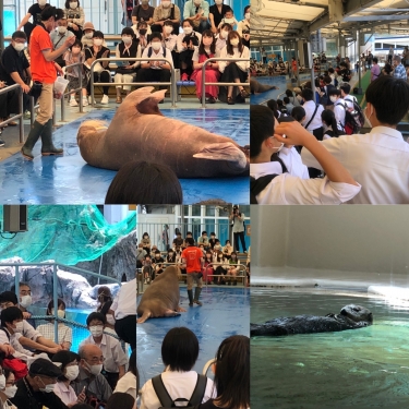 アシカショーやラッコの泳ぎを見て、楽しんでいます。よく訓練されたアシカの動きに拍手喝采!ラッコの可愛らしさに感激!