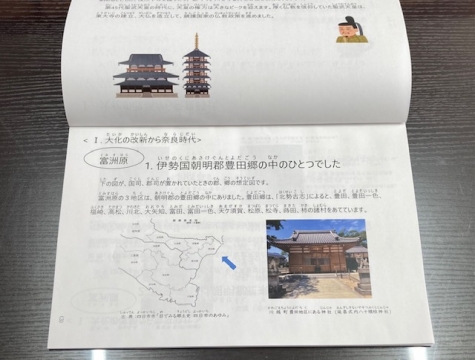 2月7日(金)、富洲原こども歴史資料作成委員会の水谷様と富洲原地区市民センターの館長様が来校され、「とみすはら歴史あれこれ(飛鳥時代から江戸時代後期まで)」を全校生徒分お届けいただきました。この冊子は富洲原地区市民センター主催による夏休み企画講座「富洲原こども歴史教室」の資料を再編集し発行されたものです。