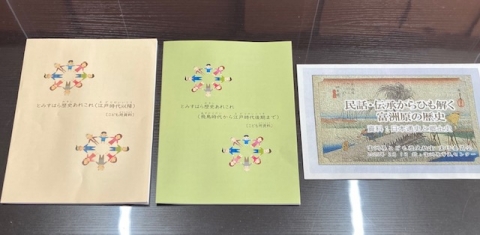 左から「とみすはら歴史あれこれ(江戸時代以降)」「とみすはら歴史あれこれ(飛鳥時代から江戸時代後期まで)」「民話・伝承からひも解く富洲原の歴史」。今回いただいたのはまん中の緑色の冊子で、左の冊子の続編になります。右は2月1日(土)に開催された大人向けの歴史教室の資料です。