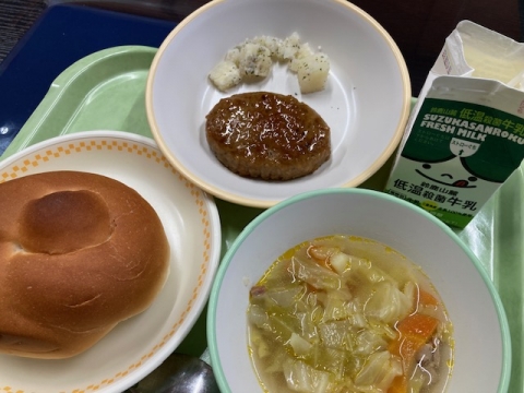 3月5日(水)の給食は、3年生にとって最後の給食になります。ミルクパン、牛乳、ハンバーグオニオンソース、粉ふきいも、野菜スープです。