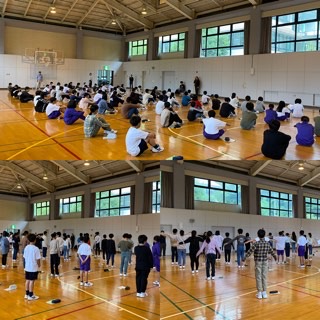 体育館で朝の集いを行いました。皆でラジオ体操をし、実行委員さんから昨日の反省や今日の活動の留意点について話がありました。皆、元気です!