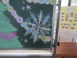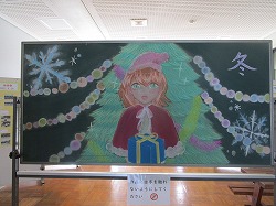 美術部の作品である黒板アートの冬バージョンが完成しました。