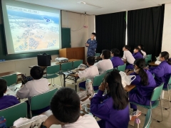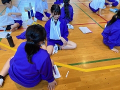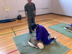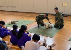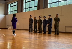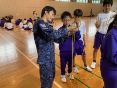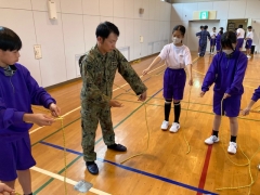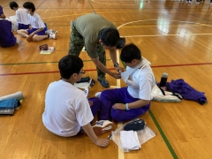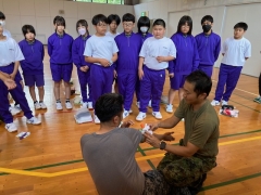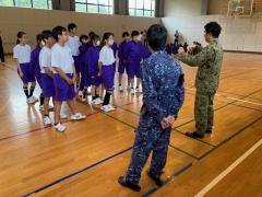 午後の活動は防災学習です。陸海空の自衛隊から7名の隊員の方にお越しいただきご指導いただいています。