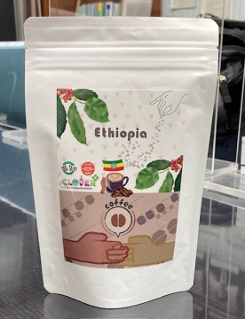エチオピア産のコーヒー豆を販売。SDGs Talksのロゴも入っています。高品質のスペシャリティ・コーヒーです。コーヒーの木はエチオピアで発見され、世界のコーヒーの木のルーツはエチオピアにあるとのこと。