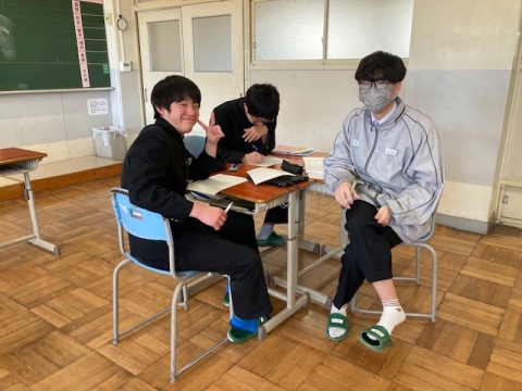 2月25日(火)、1・2年生が家でテストの勉強をしている頃、3年生は給食を食べ、午後からはレクや勉強をしながら学校で過ごしています。