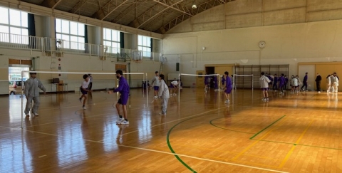 体育館ではバドミントンを楽しんでいます。6限目はバスケットボール。けがのないよう気を付けて。