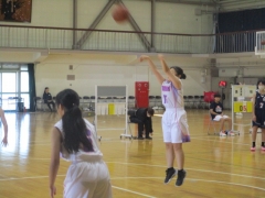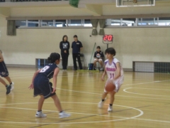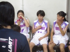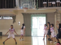 女子バスケットボールの大会は港中学校体育館で行われています。本校は港中学校との合同チームで出場し、1回戦で桜中学校と対戦しました。21対33で惜敗しました。