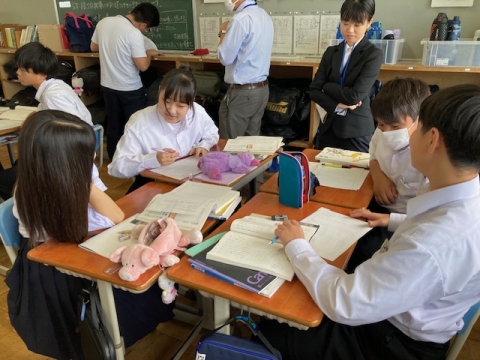 5月30日(金)、2年生の国語の授業を参観しました。単元は枕草子。この授業は自分流の枕草子(春の章)を書くというパフォーマンス課題です。研修の一環で他の教師も参観しています。