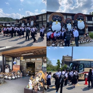 信楽陶苑に到着しました。大きなたぬきがお出迎えしてくれています。皆で記念撮影をして、これから陶芸体験です。うまくできるでしょうか。