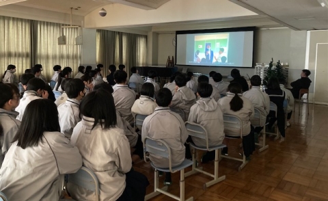 3月4日(火)午前、3年生がホールでスライドショーを見て富洲原中学校での3年間を振り返っています。1枚進む毎に歓声や笑い声が聞こえます。