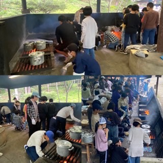 かまどの火を安定的に維持するのは、なかなか大変です。薪を追加して団扇であおぎ、火を調整します。薪が足りなくなると、上に薪を取りに走ったりと、大忙しです。煙の中で大奮闘。安定した火力で、美味しいカレーを作りましょう!