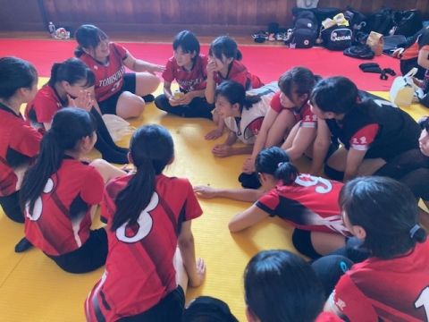バレーボール部。1回戦で大池中学校を破り、和やかにミーティング中。