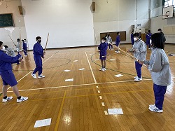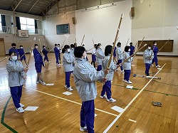 生徒たちは、竹刀を持ち構え、素振りをする練習を行っていました。