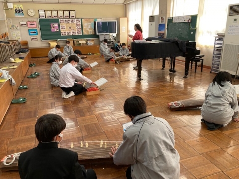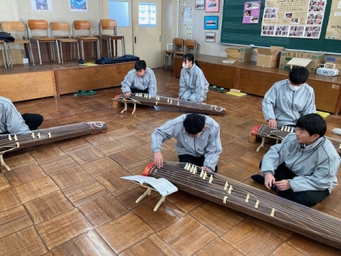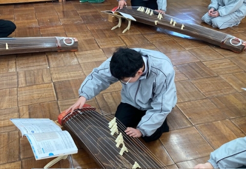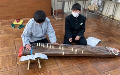 1月31日(金)、1年A組の音楽では「さくらさくら」を筝で演奏しています。楽譜は音符ではなく、縦に見る表の中に漢字や記号で記されています。筝は七面。二人が交代で使っています。