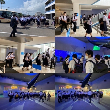 鳥羽水族館に到着しました。バスから歩いて鳥羽水族館に入りました。これから班別分散です。計画にしたがって見学をします。お土産も買えるので、スケジュール管理をしっかりね。