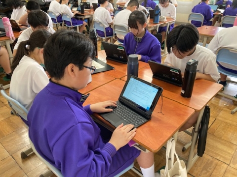 教室で今回の避難訓練を振り返っています。