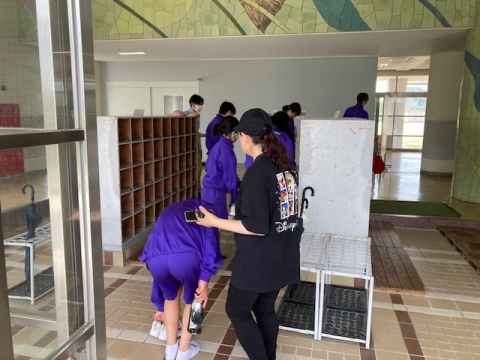 Temporary evacuation to the schoolyard in slippers. Students brought their gym shoes and water bottles. Although we did not do so this time, it is assumed that students would change into their gym shoes at this point.