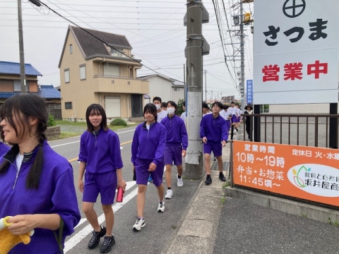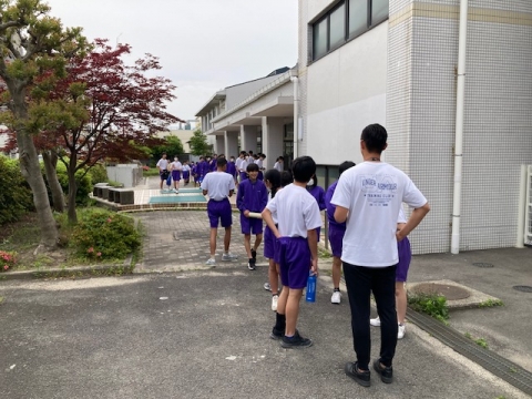 今回は前回とは違う試みを行っています。まず、運動場への一次避難はスリッパのまま行いますが、その後の避難を安全に行うため体育館シューズを持参しています。そして大きく違うのは、屋上に二次避難するのではなく、できるだけ内陸部へ二次避難を行うことです。これは本校では初めての試みです。