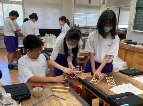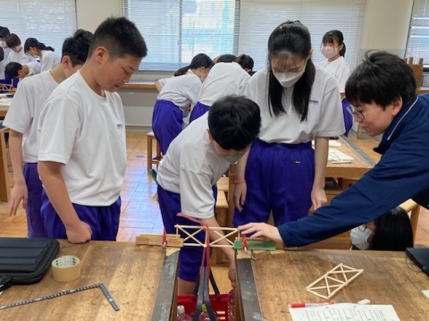 1年生の技術。今回はブリッジコンテストです。「丈夫な橋を設計せよ」ということで、これまで設計、製作してきた橋の模型が、どれだけの重さに耐えられるか実験しています。