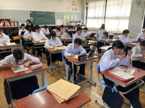 1年生のベーシックの様子。1年生のベーシックでは漢字、計算問題、英単語、視写(書き写す)、新聞、タイピング練習、ワークに取り組みます。