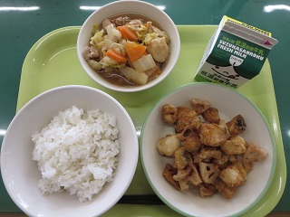 ほきとれんこんのあげがらめは大人気でした!白菜炊きも好きな子が多く、どちらもおいしくいただきました。(2B)