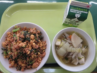 鮭の三色丼のようなメニューだと、野菜が苦手な子も頑張って食べられるようでした。けんちん汁も具だくさんでおいしかったです。ごちそうさまでした。(3A)