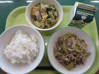 豚肉のしょうが炒めは人気で「うまい!」と言って食べていました。白菜炊きはたくさん食べる子もいれば、少ししか食べない子もいました。ごちそうさまでした。(2B)