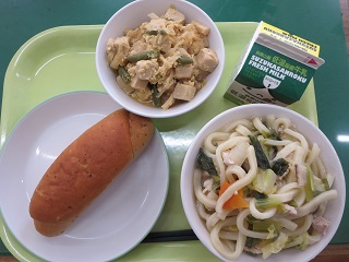 鶏なんばうどんはふたを開けた時からいい匂いがしていて、子どもたちは「いい匂い!」と喜んでいました。高野豆腐の卵とじは少し残す子もいましたが、最終的には完食できました。ごちそうさまでした!(2B)