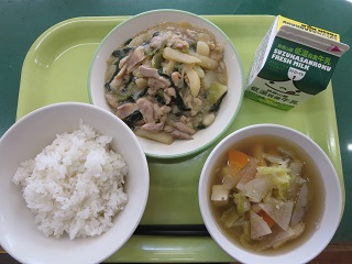 鶏肉の塩こうじ炒めはとても人気でした。何回もおかわりをしたい子が続出しました。ごちそうさまでした!(4B)